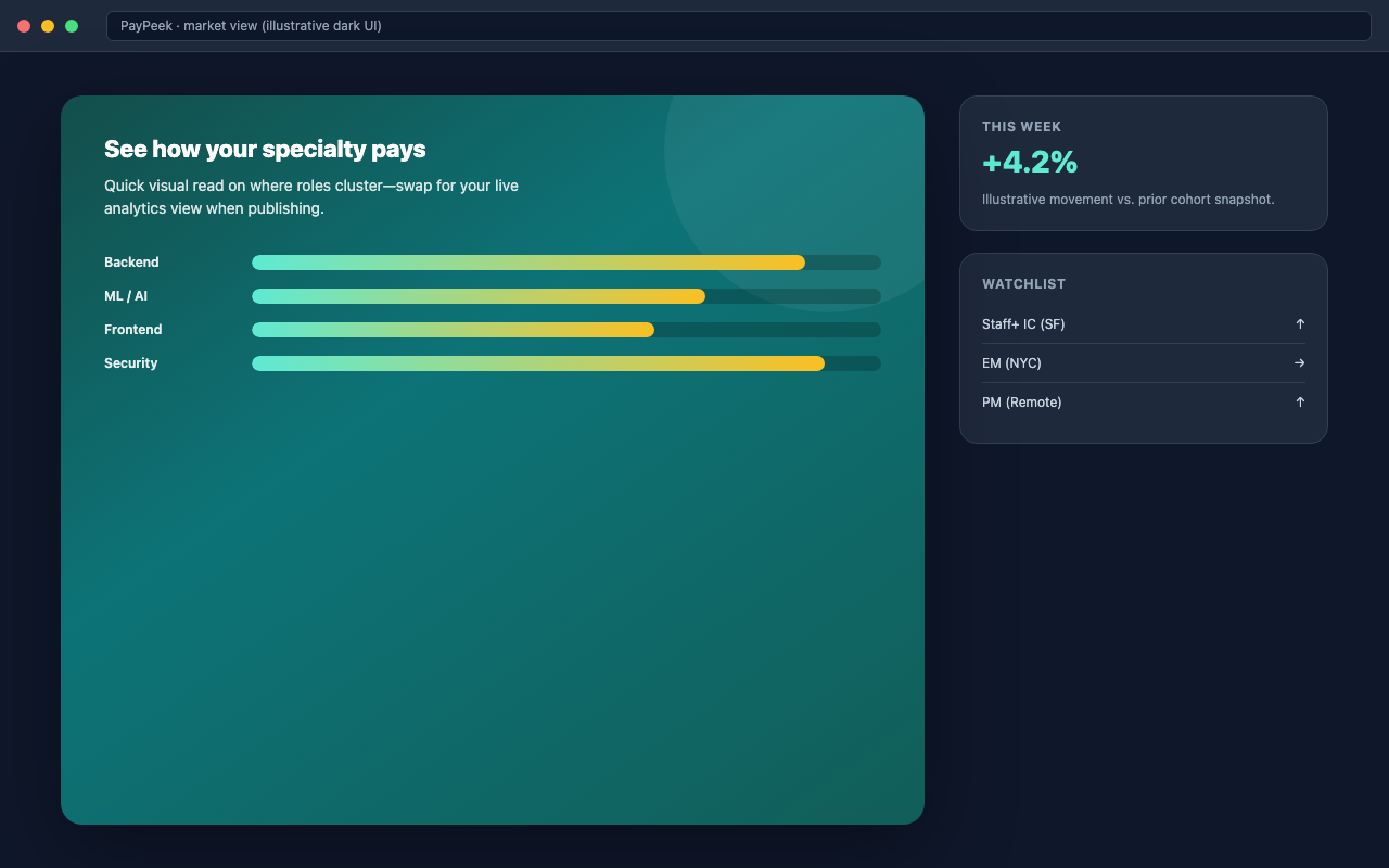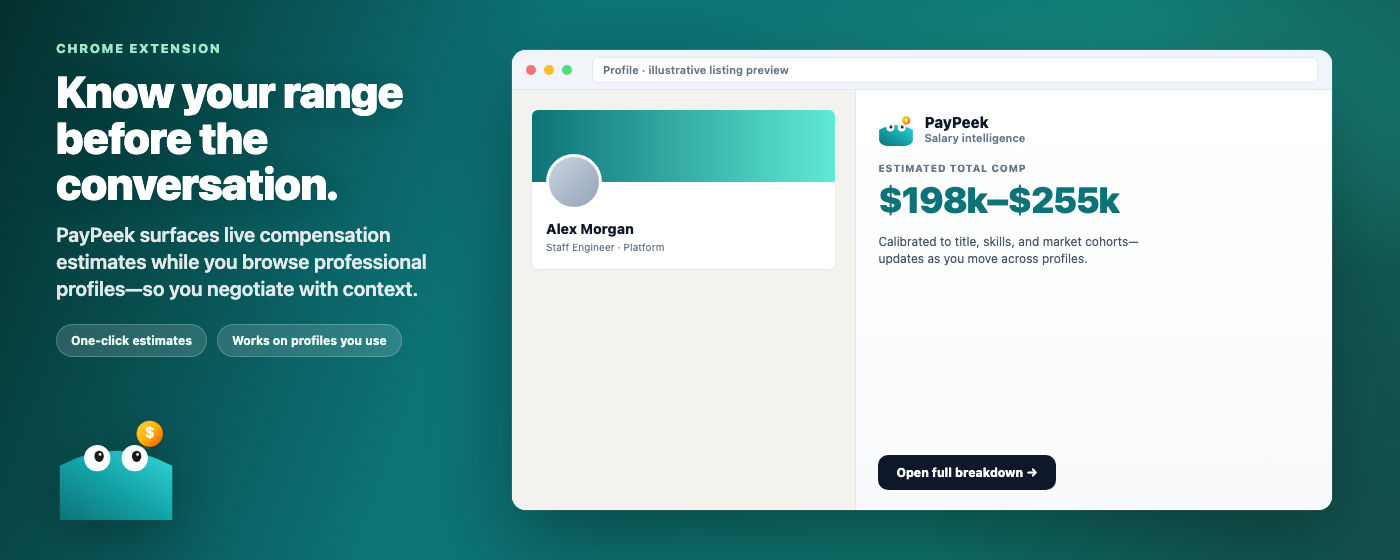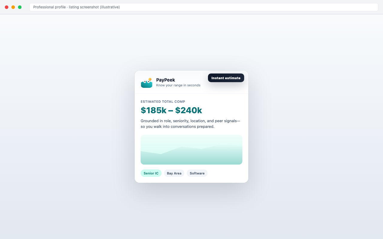 Outcome-led headline + live mock of profile + PayPeek panel. Marquee is your only chance to sell the workflow—lead with the negotiation benefit, then show the UI proof.