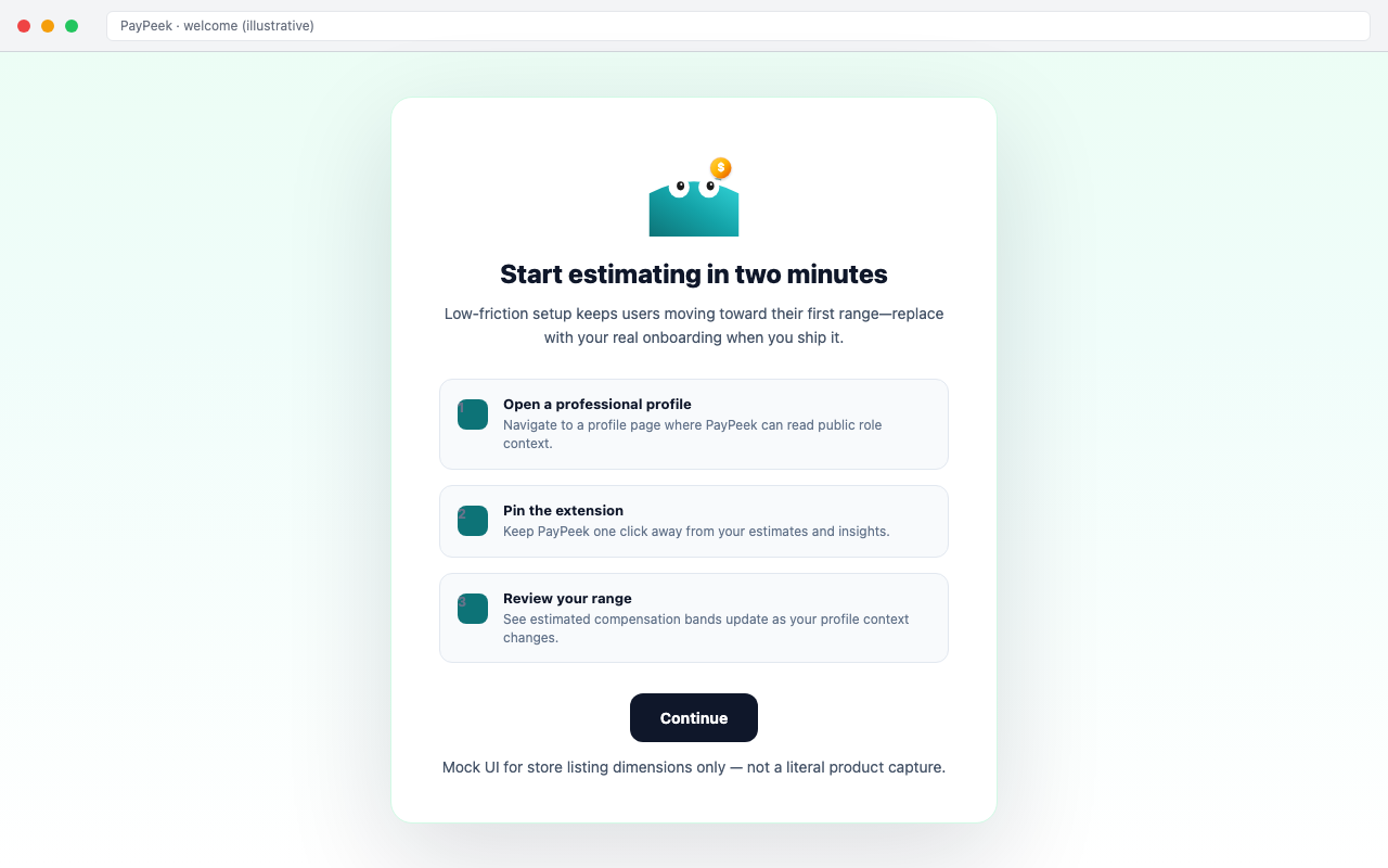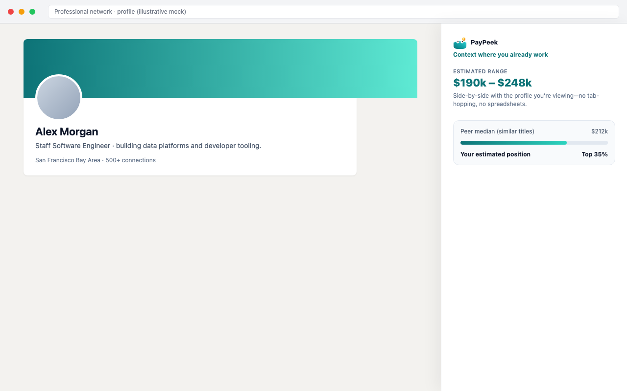 Outcome-led headline + live mock of profile + PayPeek panel. Marquee is your only chance to sell the workflow—lead with the negotiation benefit, then show the UI proof.