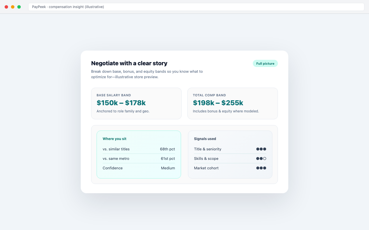 First screenshot should answer “what do I get?” in 2 seconds: big comp band, credibility line, role/geo chips—reduces bounce from the listing carousel.